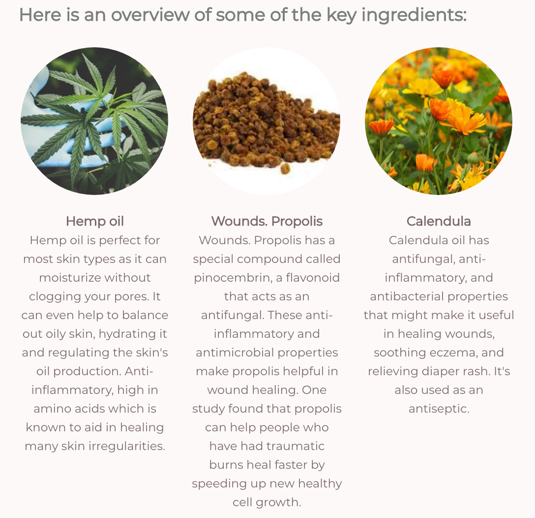 -specially tailored wound care promotes faster healing with ingredients such as arnica, calendula, propolis, lavender, chamomile, carrot, and cannabis oil