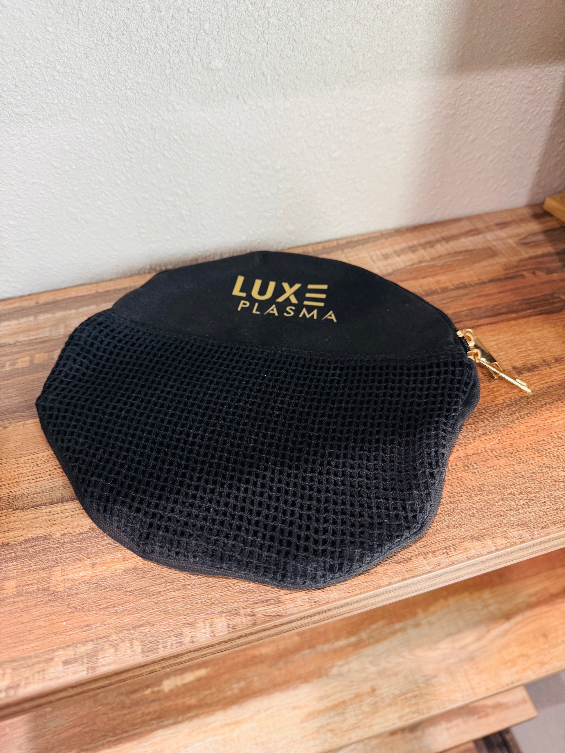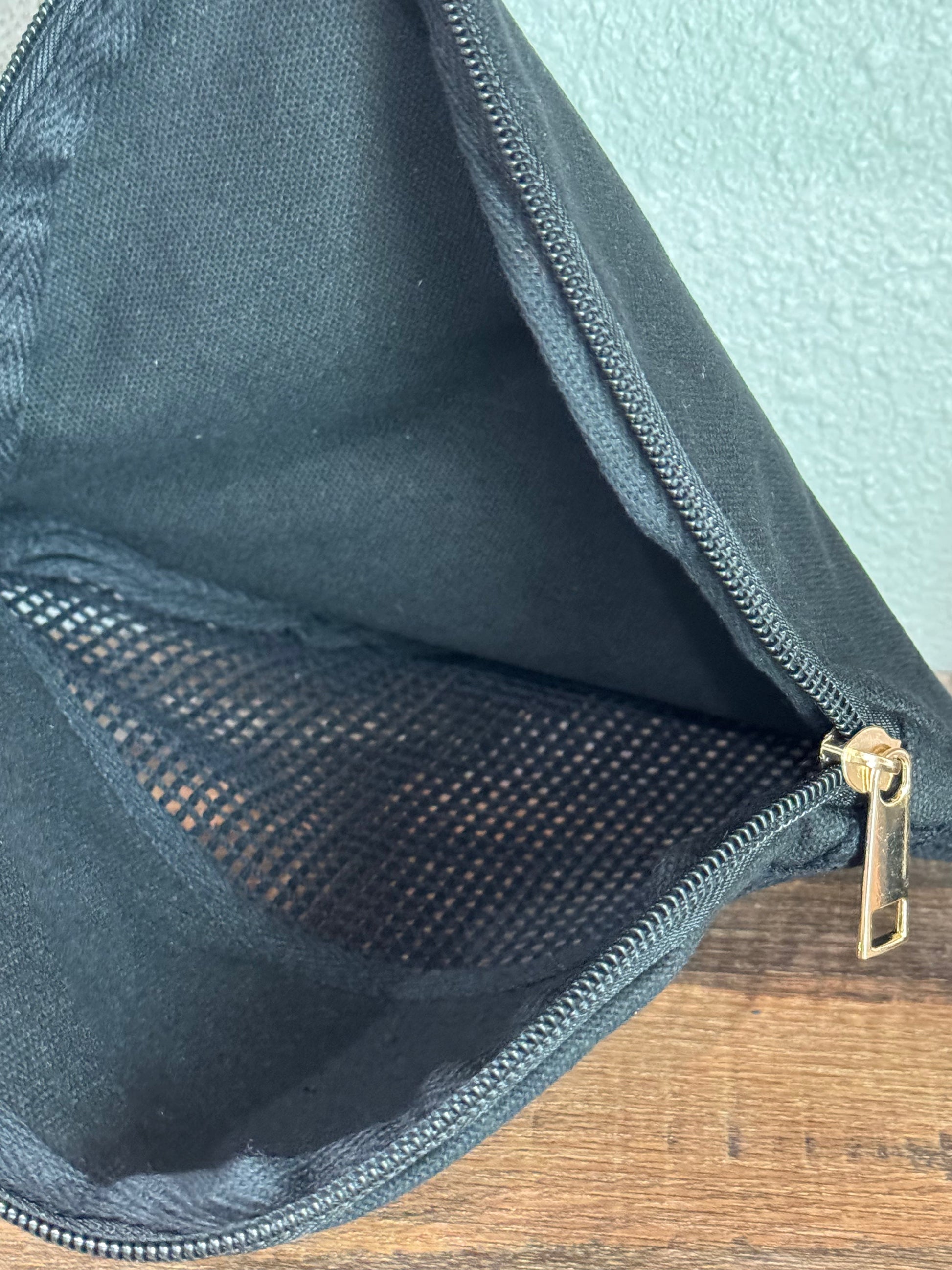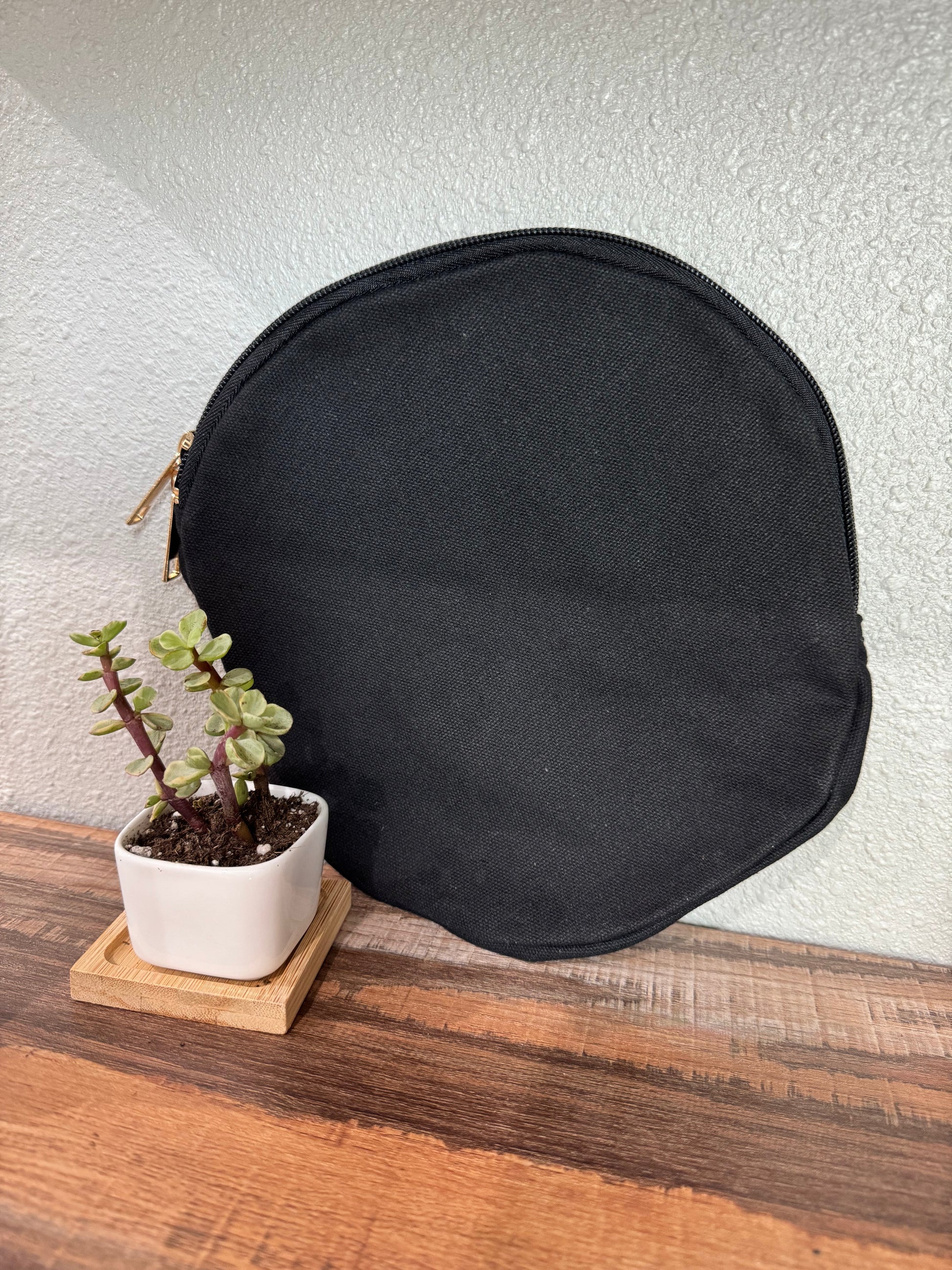 High quality. Round Canvas mesh pouch with zipper. Black and gold. 8.5inches in diameter. Products not included.