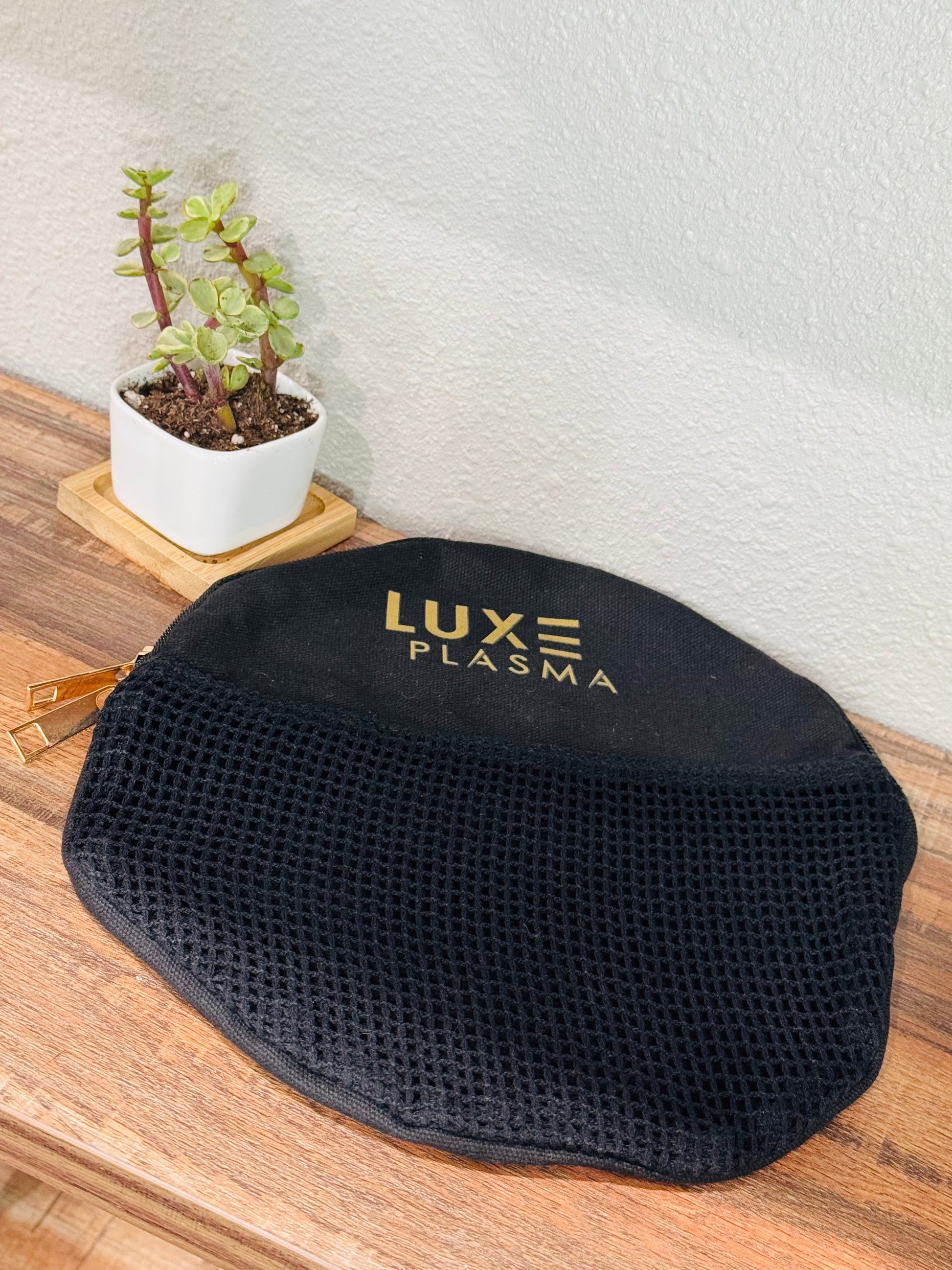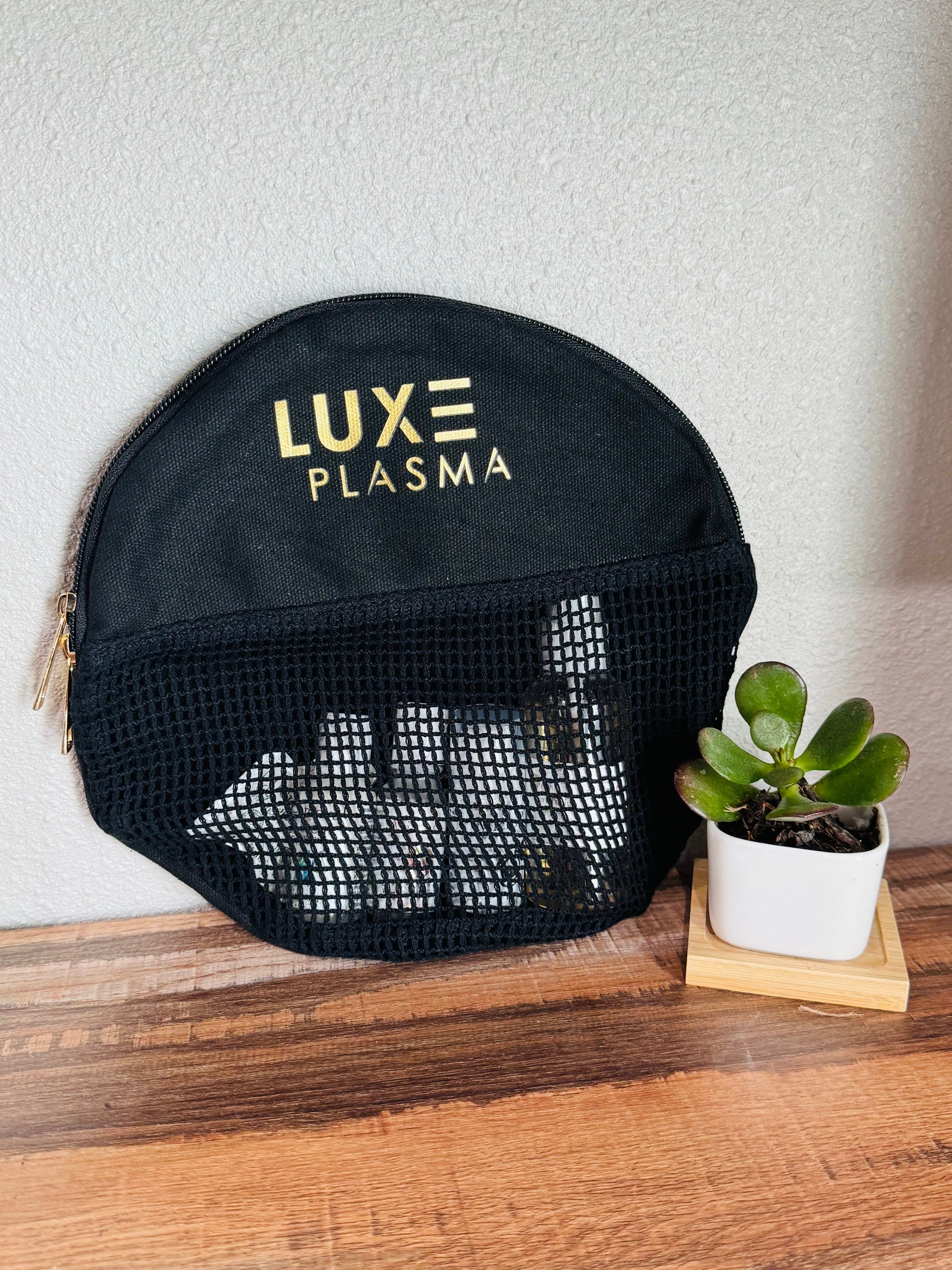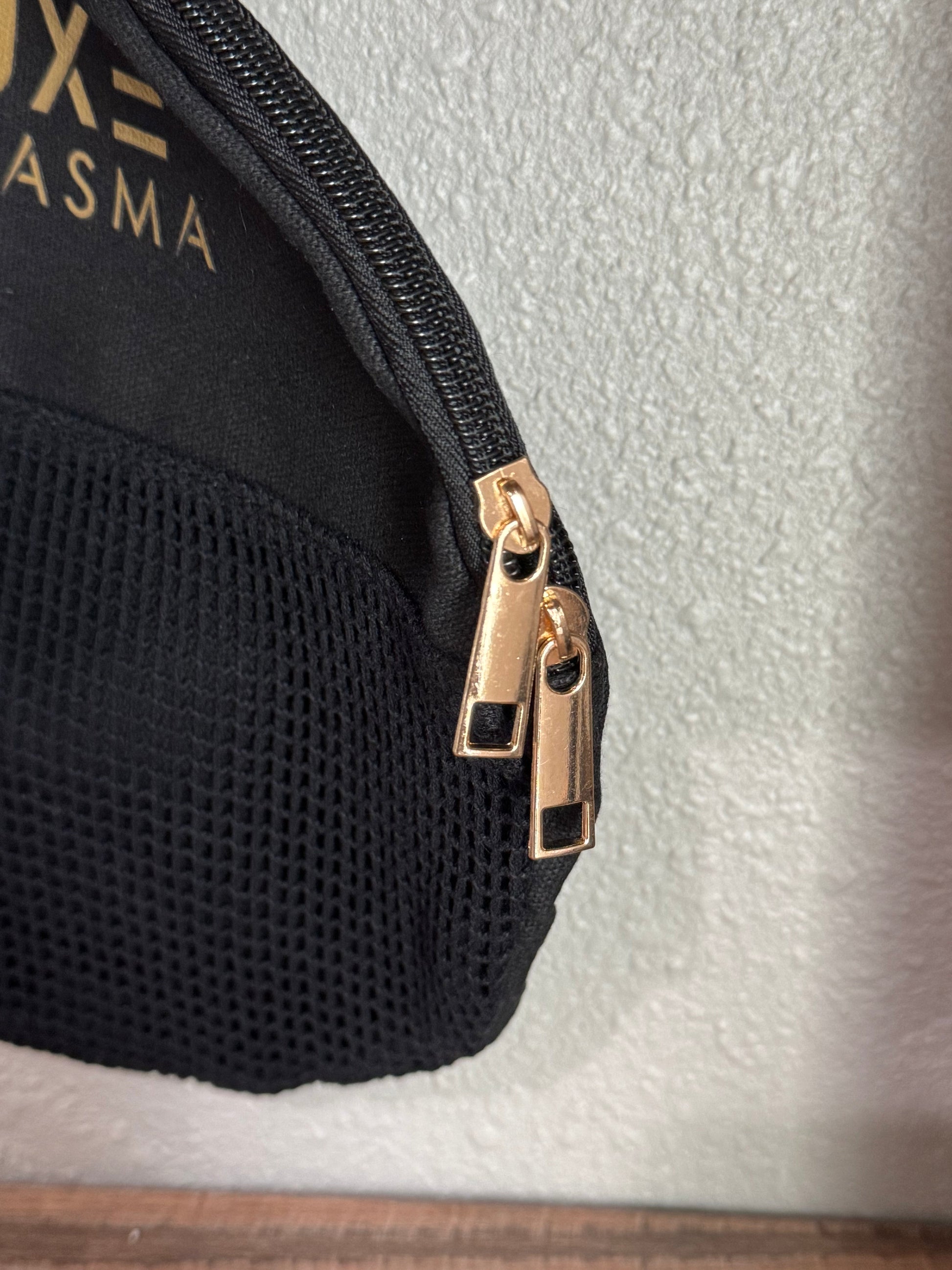 High quality. Round Canvas mesh pouch with zipper. Black and gold. 8.5inches in diameter. Products not included.